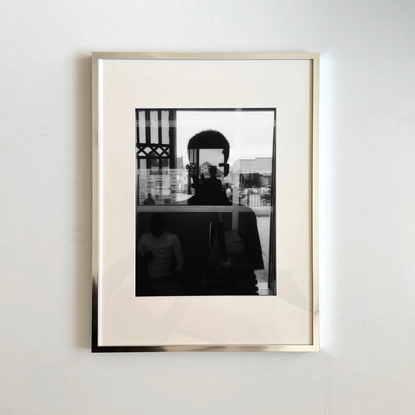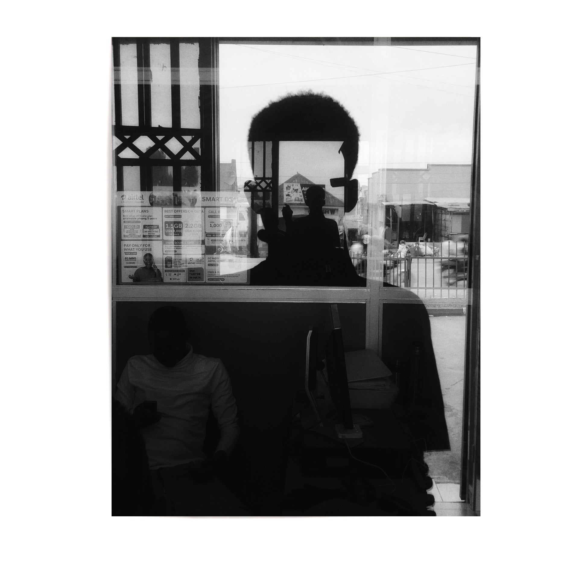 Motiv Kampala zeigt den Fotografen Ammar Yassir in der Reflexion einer Scheibe, beim Kauf einer SIM-Karte.