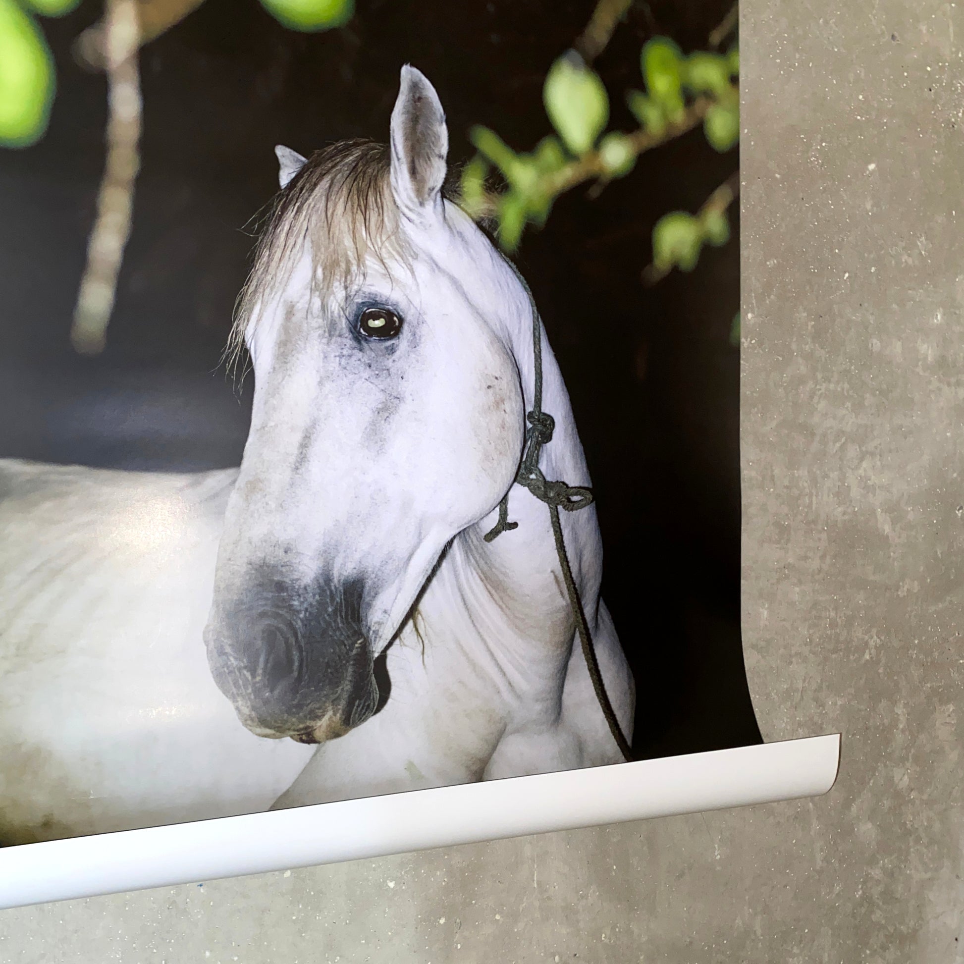 Der extra große Posterdruck des Motivs Principe ist ein Portrait. Er zeigt den Hengst des Umweltschützers Carlos Zorrilla im Intag Tal, Ecuador. Ein bisschen schüchtern, aber doch zugewandt schaut das Pferd namens Principe in die Kamera.