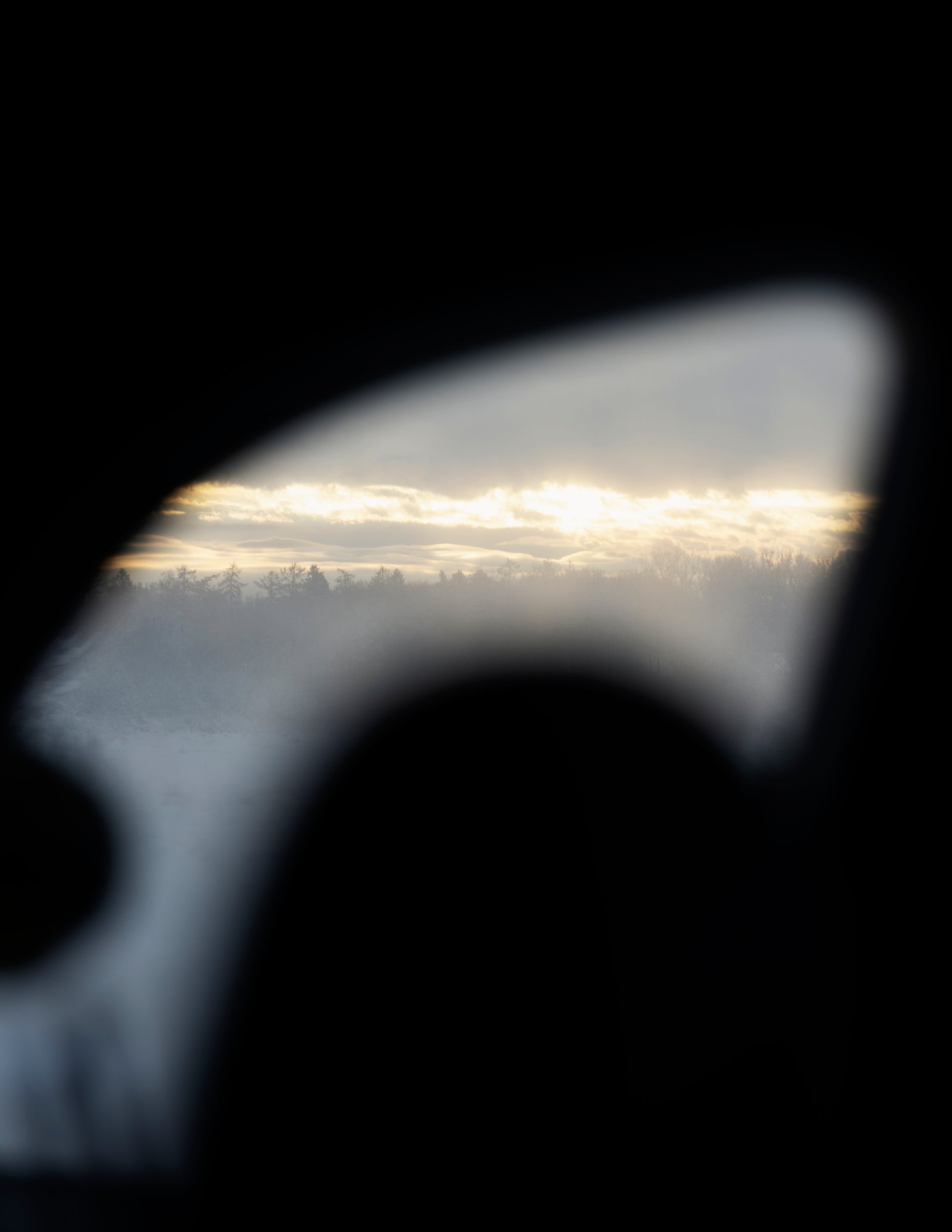 Der Blick aus dem Auto über das Oder Delta. Weiche Unschärfen und die runden Formen von Kopflehne und Fensterrahmung formen einen kleinen Ausschnitt der weiten, fast wilden Landschaft. Fotografiert von Marzena Skubatz 2022 für Greepeace.