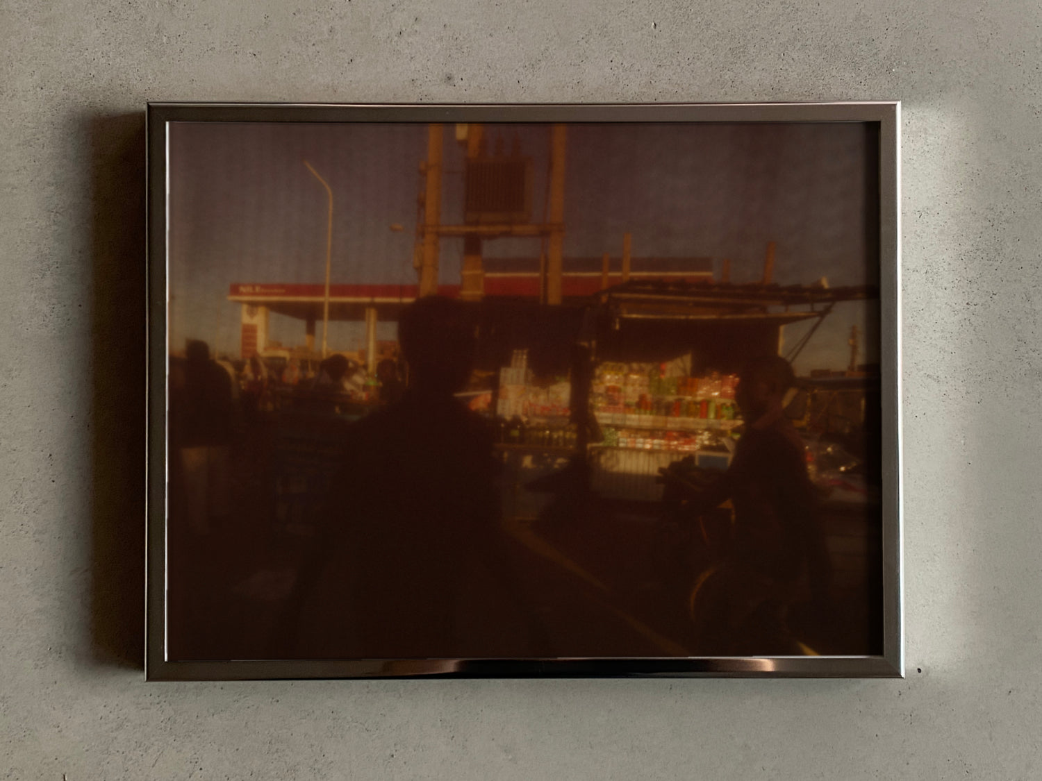 Alltag in Khartoum in der Kulisse eines glitzernden Kiosks und einer aufragenden Tankstelle im Hintergrund — hinter dem weichen Changeant-Effekt eines schützenden Netzes.