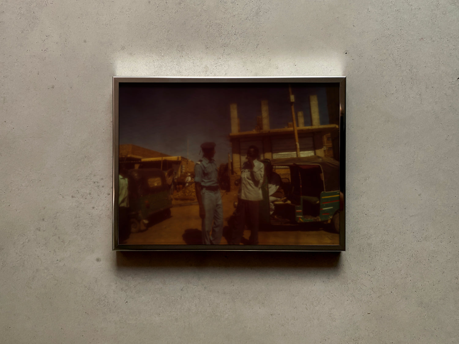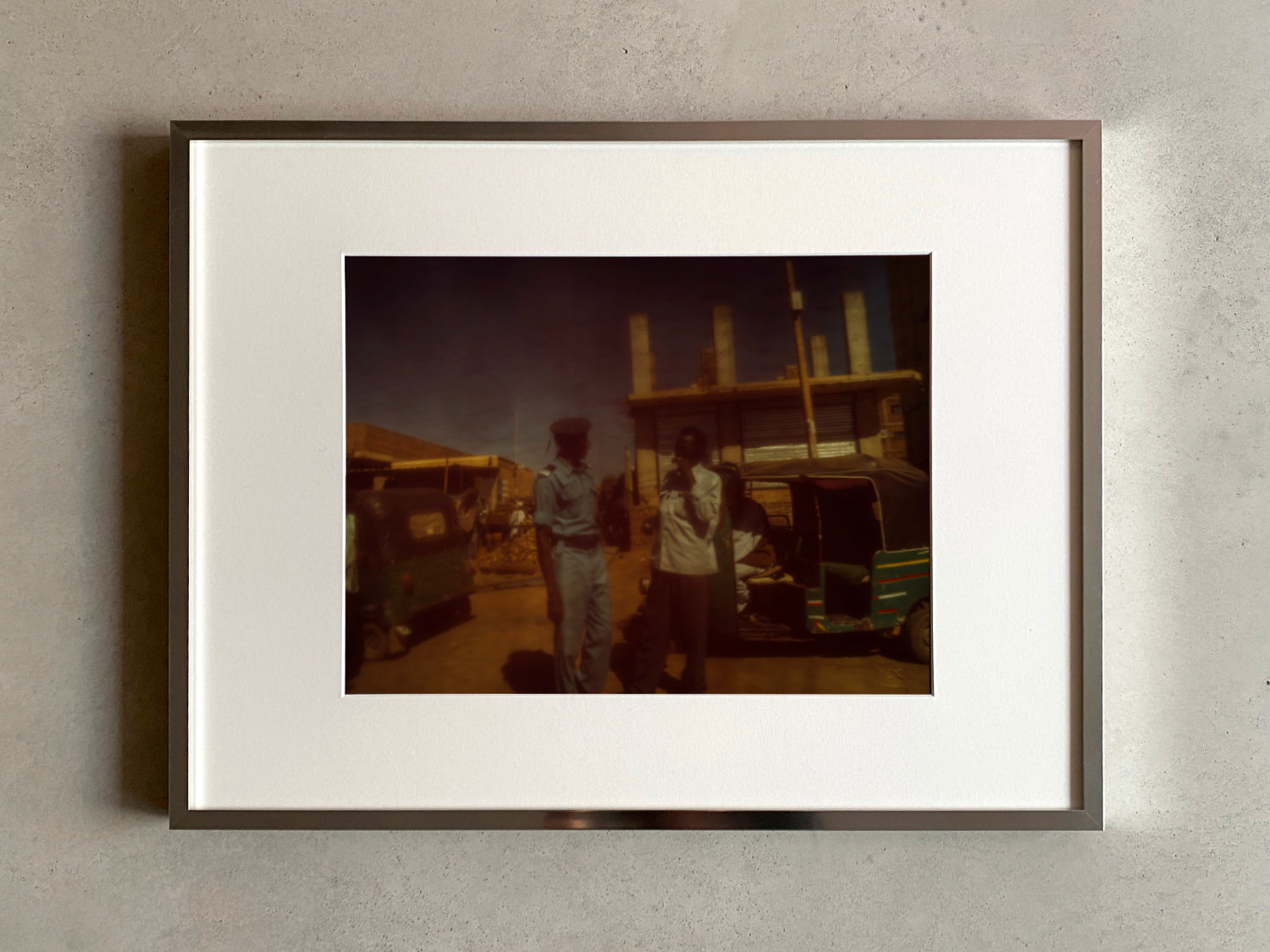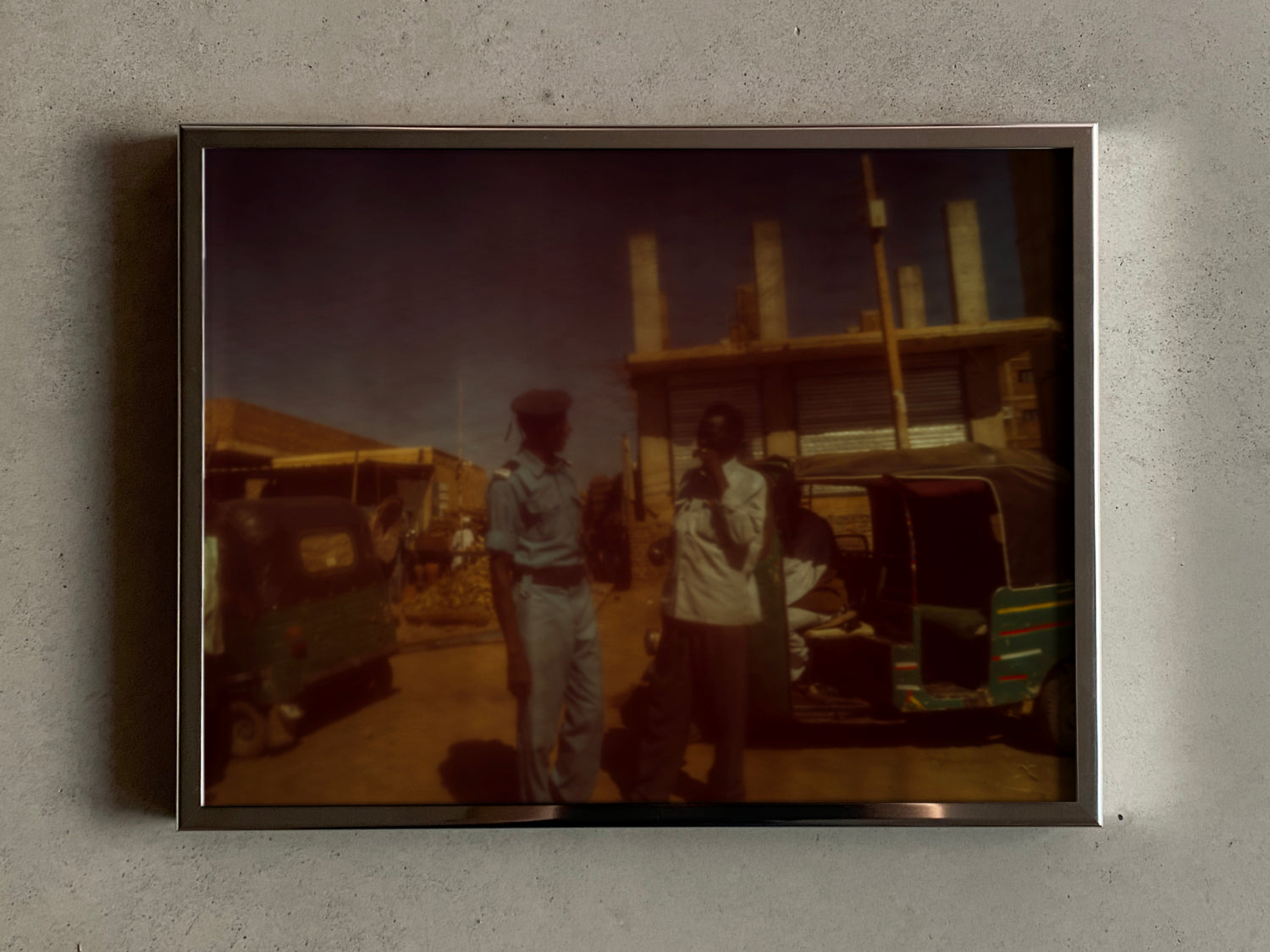 Das Motiv Khartoum 5 fährt an einem Gespräch zweier Männer in Khartoum vorbei. Zentral eingefangen, im Zentrum des Motivs, vor Tuk-Tuks, Gebäuden und dem strahlend blauen Himmel — gesehen durch den Changeant-Effekt eines Netzes.