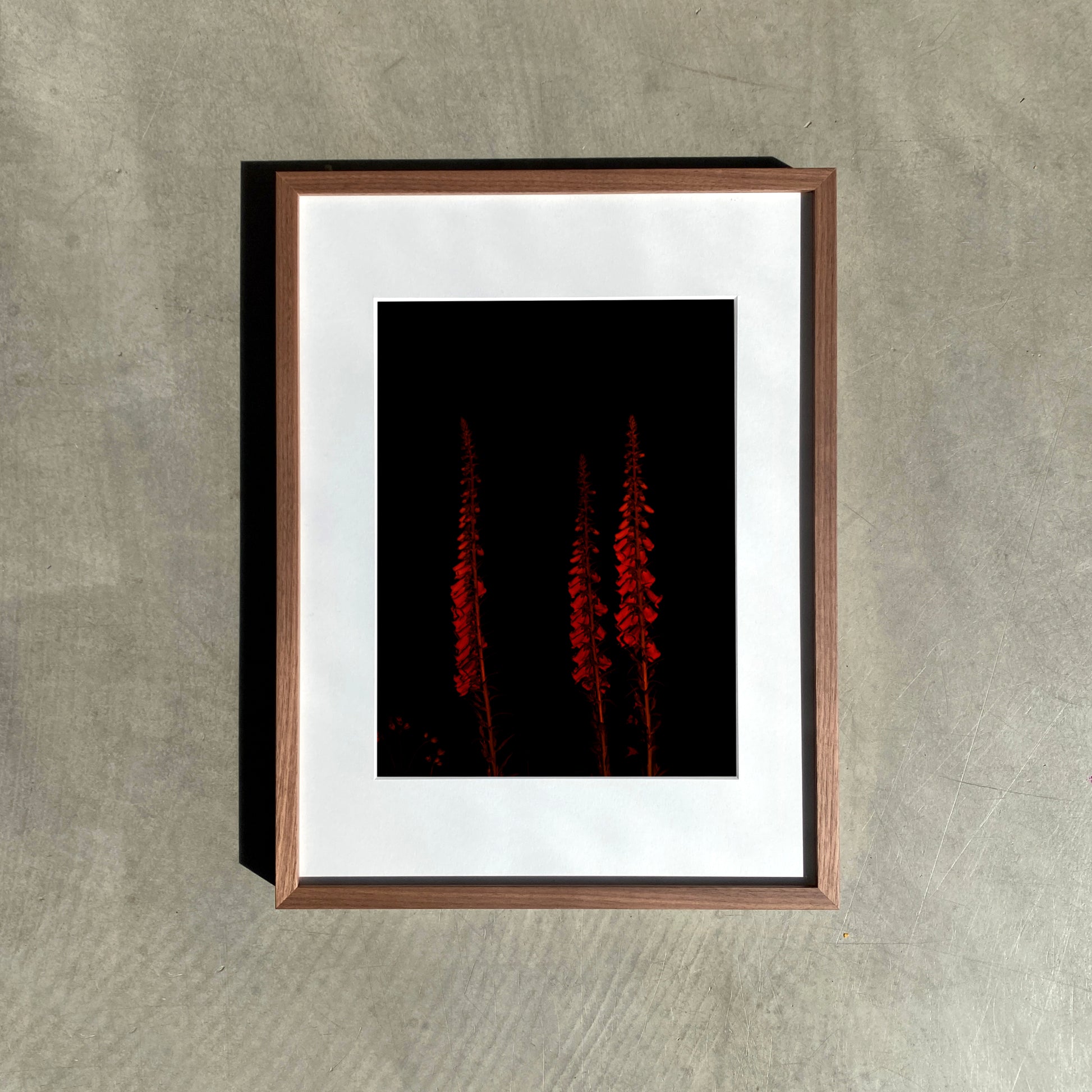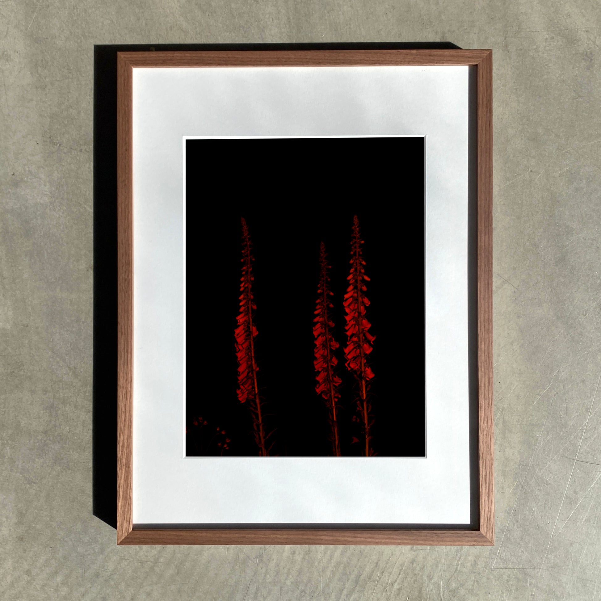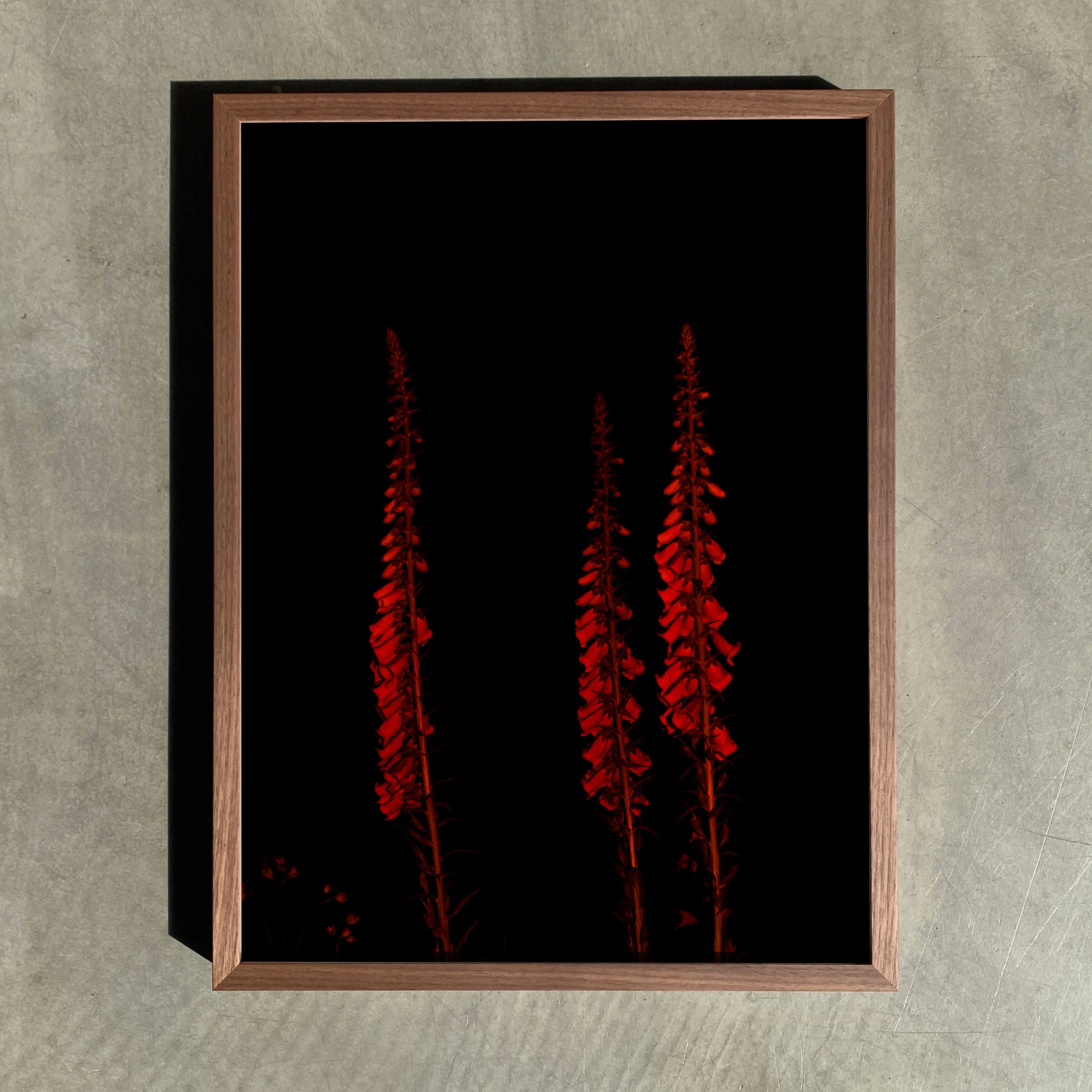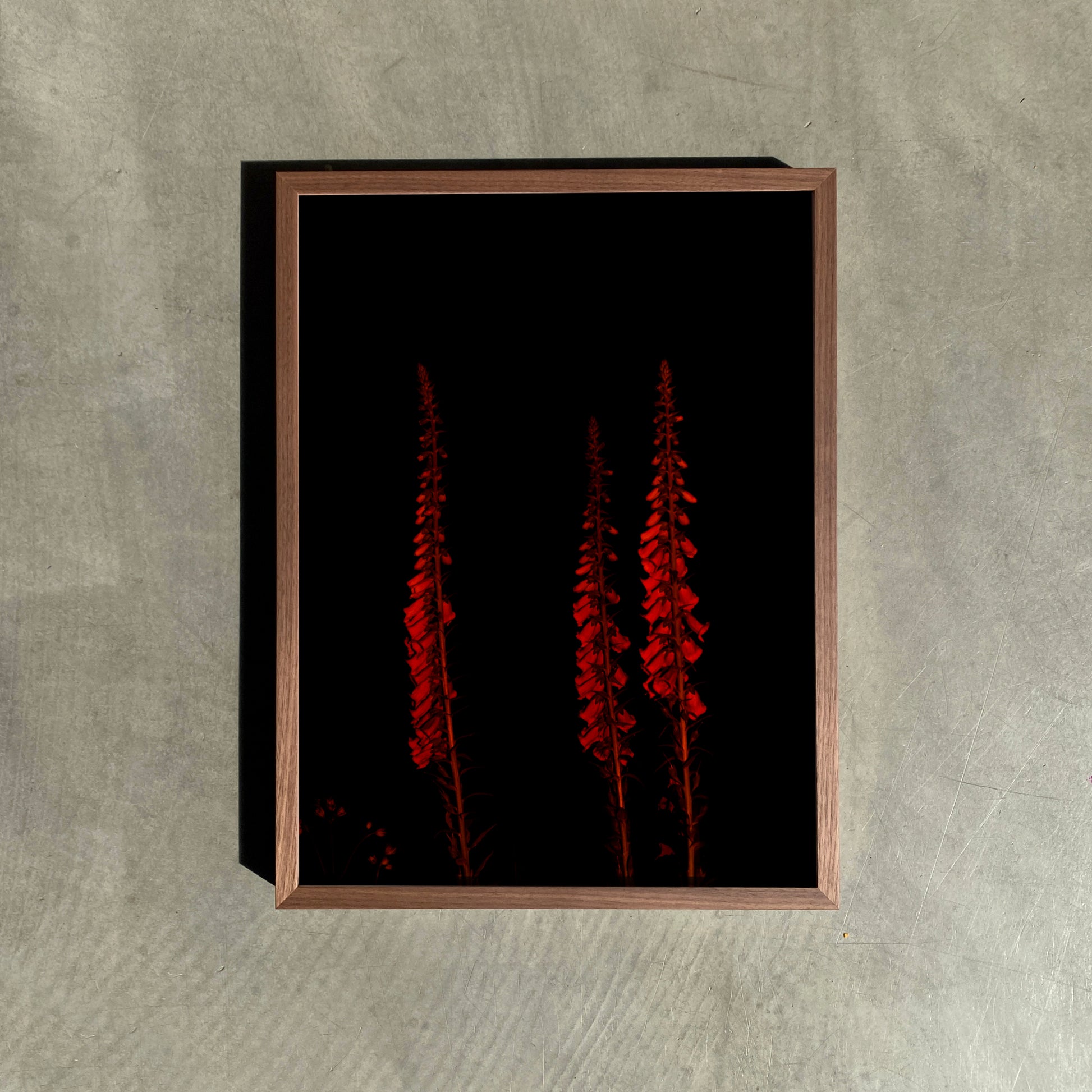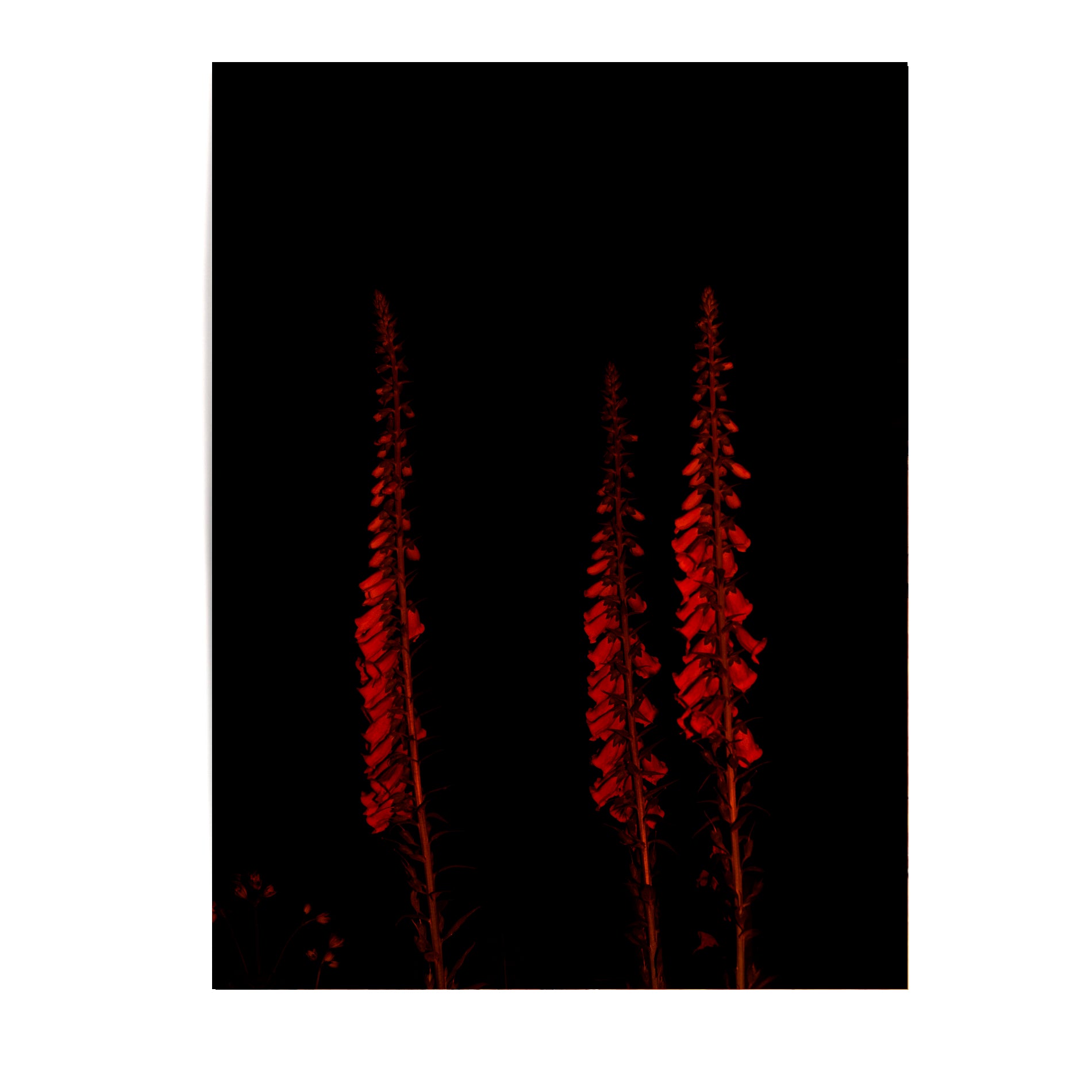 Drei giftige Fingerhüte stehen in der Finsternis, wie das mehr oder weniger mystische Portrait einer Metalband. Die langsam rhythmische Komposition, in kraftvoll monochromer Farblichkeit strahlt Ruhe und Tiefe aus. Fotografiert von Melina Mörsdorf steht dieses Motiv für Leben-und-Tod, so hart und schön das auch sein mag.